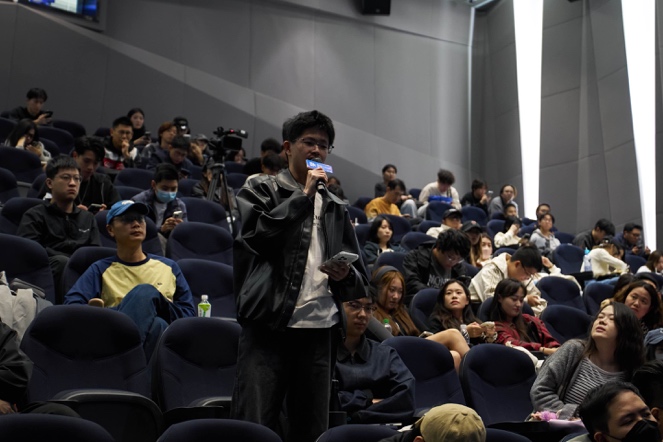 在問答環節中,同學們積極與嘉賓互動,現場氣氛十分熱烈。提問內容涵蓋影像技術、AI、虛擬製作與青年電影人如何起步開展創作等多個話題。有同學詢問「技術革新是否會改變電影敘事」,Brook 回應指出當前攝影設備已十分成熟,技術不再主導故事方向,真正重要的是光線、節奏與角色情感——「技術是工具,故事永遠是核心。」也有同學關注「AI 是否會取代劇組工作」,Brook 表示 AI 能協助預視、剪輯等流程,但無法替代現場的創造力與人與人之間的合作,「AI 不能取代真實的情感交流。」